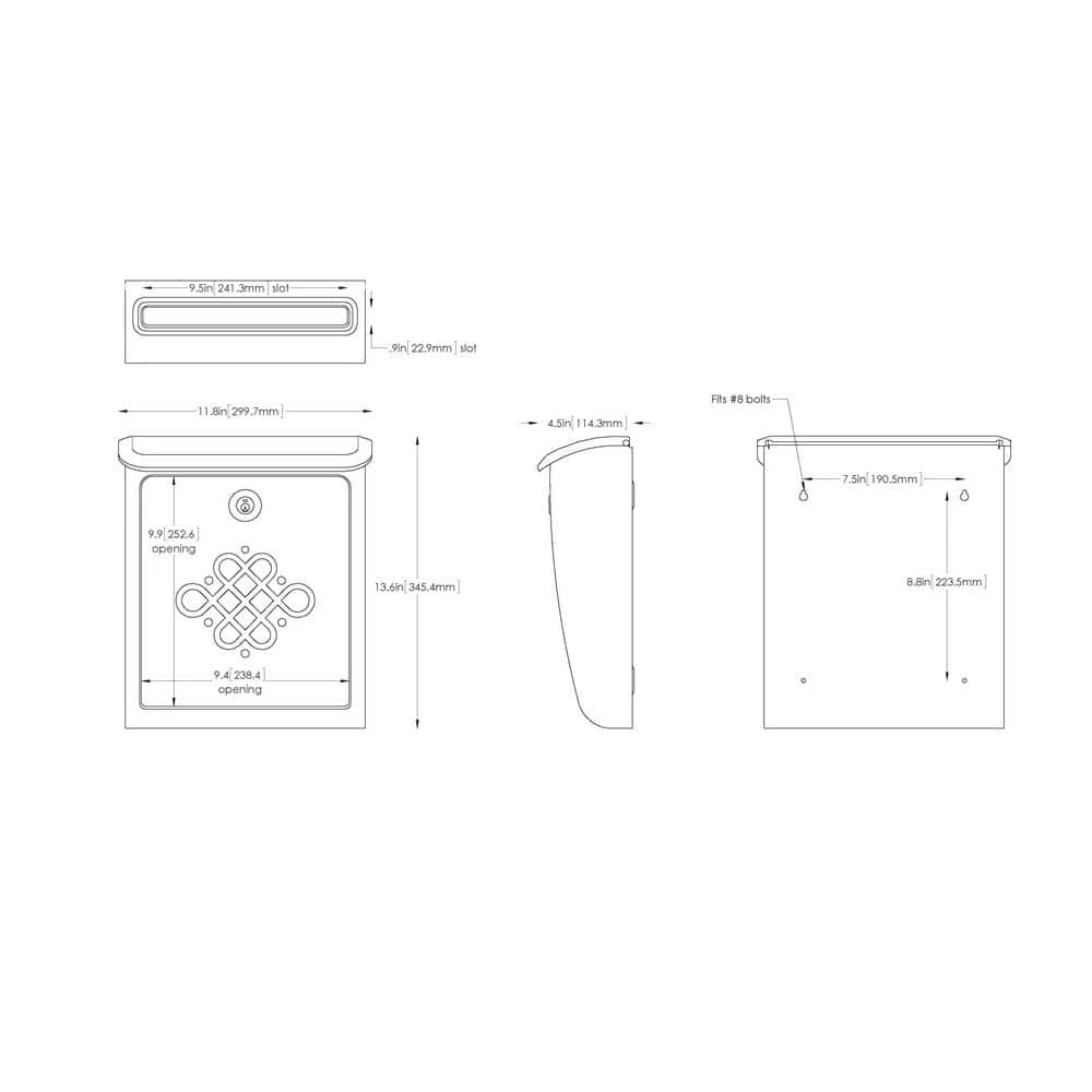 - Mailbox is 11.8 in. W x 13.6 in. H x 4.5 in. D