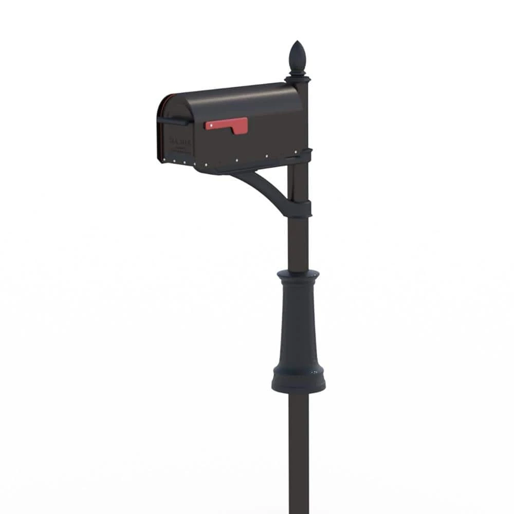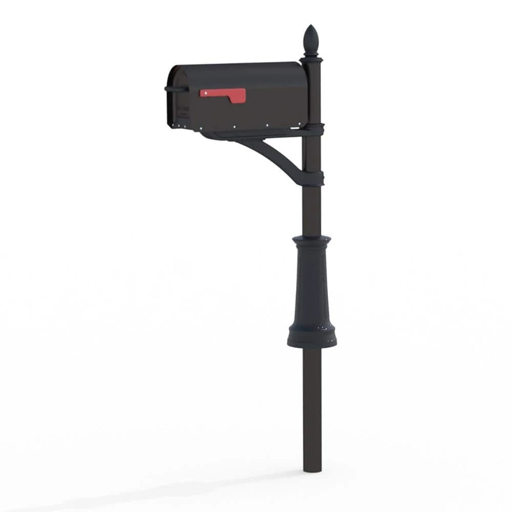 The Sequoia Mailbox and Hamilton Decorative Post Combo Kit is your quick solution to increasing your curb appeal. The Sequoia Mailbox’s durable construction is built to withstand abuse with an extra thick galvanized steel body. The Sequoia design element is classic with a durable black powder coat and red flag and is paired nicely with the Hamilton Post. The Hamilton Post is made from cast aluminum, galvanized steel and then fully powder coated for added durability and corrosion resistance. This post offers a beautiful design with highly functional elements such as a telescoping arm that can be raised and lowered and also rotated 360°. To finish this design it comes complete with a molded ABS fluted base to cover and protect the post from weed whackers and hide any unsightly concrete. If you are looking for a mailbox and post to withstand the snow plow and baseball bat run-ins, look no further.