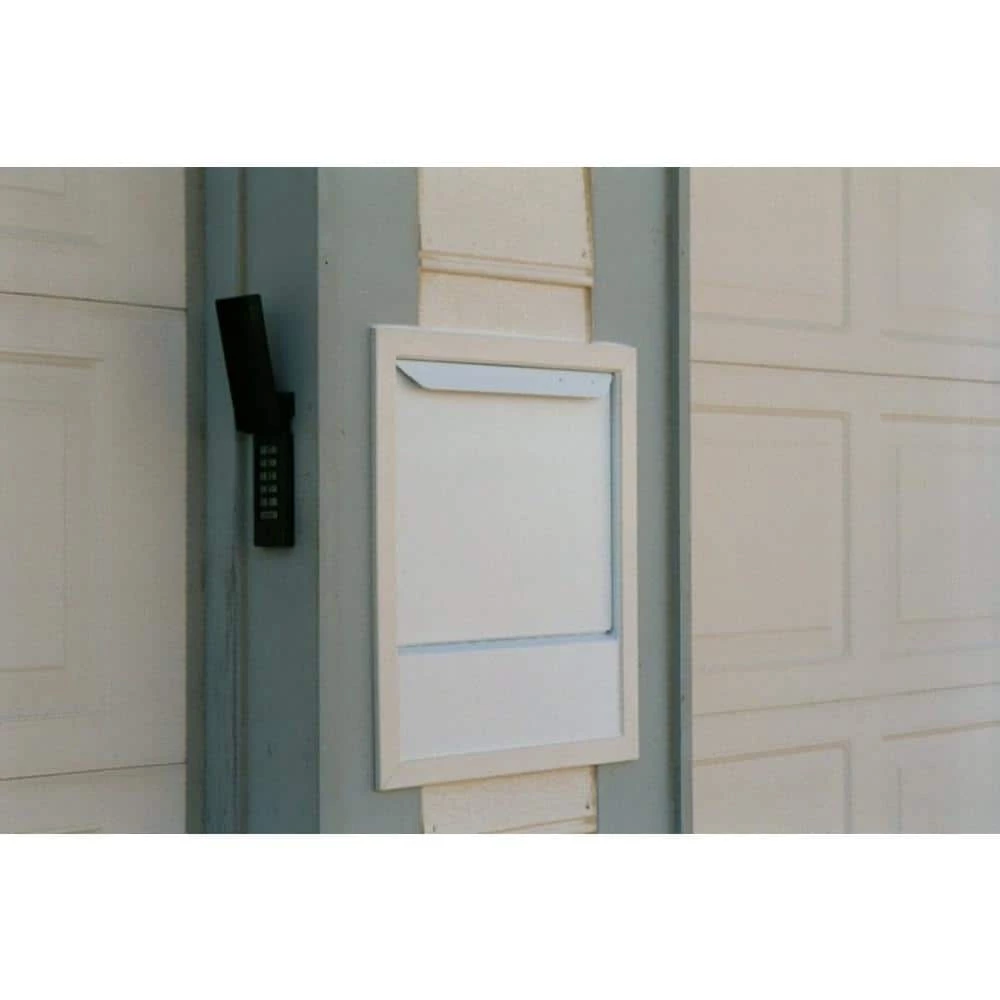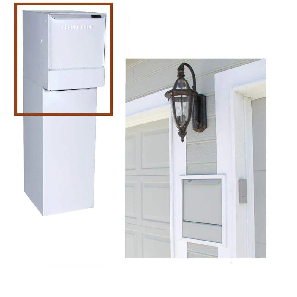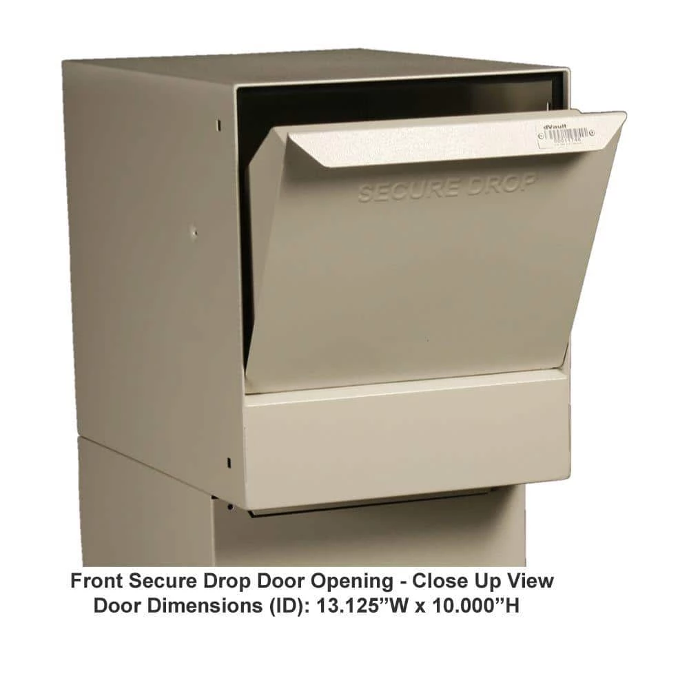 The Package Drop Top Vault offers Home/Office and Commercial Through Wall Delivery. The unit fits between wall studs (16 in. centers) for easy installation in any stage of construction or remodel. The delivery door mechanism is set forward 4 in. for flush mount to exterior walls. Its unique security drop door mechanism and secure storage compartment prevent access to deposited mail and packages (U.S. Patent Number 6,347,737) Wall Mount Delivery Top Vault is constructed from heavy duty 16 galvanized gauge steel with a durable gray powder coated polyhammer finish. The unit can be enhanced during installation with decorative options to blend into architectural and landscaping themes. A key locked bottom hold that is recommended for additional security purposes is sold separately. Without the bottom hold, deliveries to the Wall Mount Delivery Top Vault would simply fall to the floor in the interior of the structure where it is mounted.