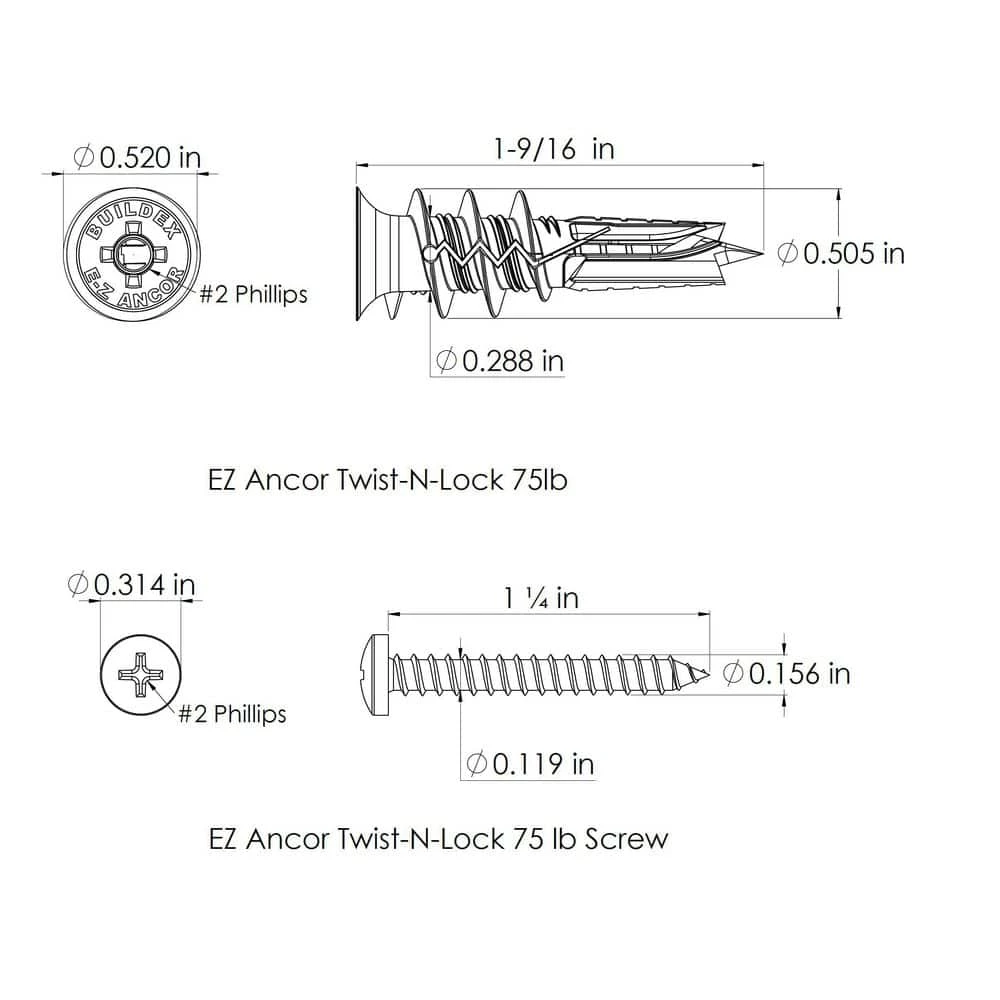 E-Z Ancor Twist-N-Lock 75 lbs. Medium-Duty Drywall Anchors (50-Pack) are ideal for hanging pictures, mirrors or installing shelving. The anchors are easy to install or remove using only #8 x 1-5/8 in. screw (included) and a #2 Philips screwdriver. No pre-drilling is necessary – screw directly into drywall.