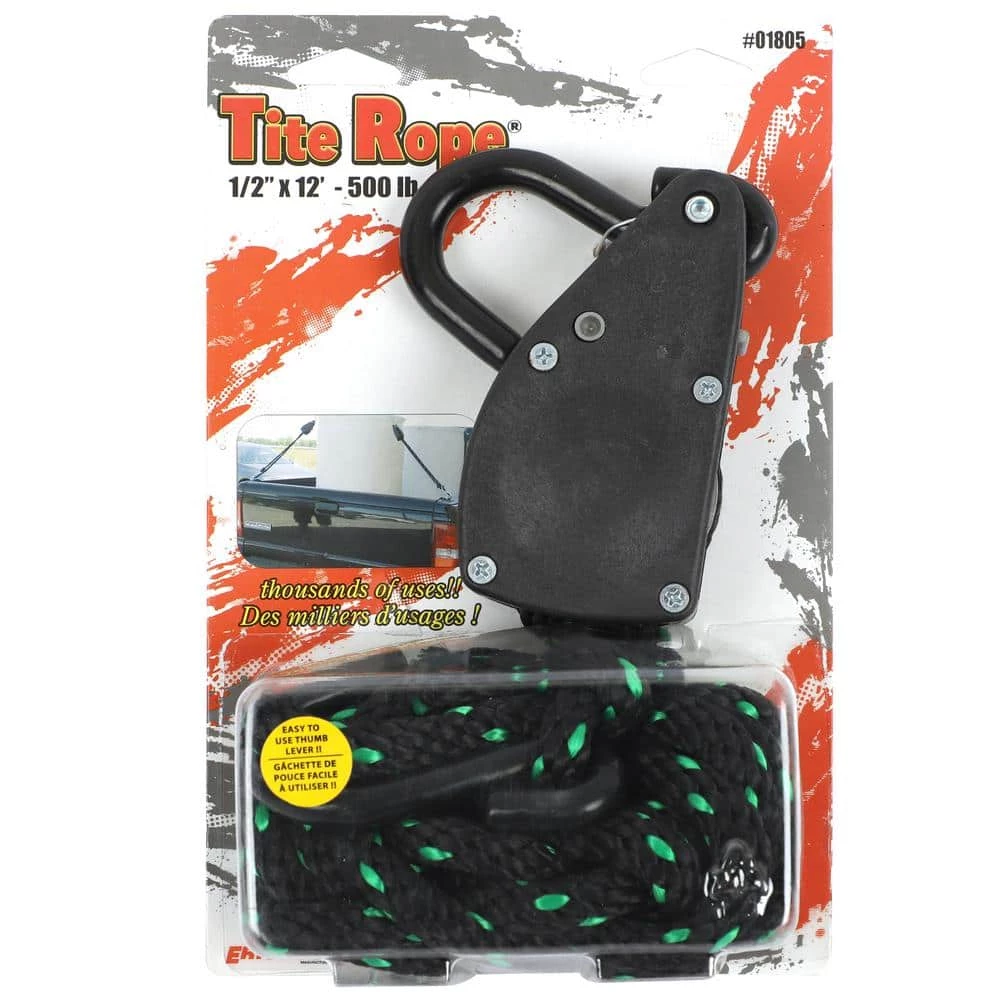 Great for 100’s of uses. The Tite Rope is a simple pull and lock mechanism that is easy to use. Simply pull on the end of the rope with no hook until tite, to unlock simply lift up on the release tab. Keeps your cargo secure and tite. Rated up to 500 lbs.