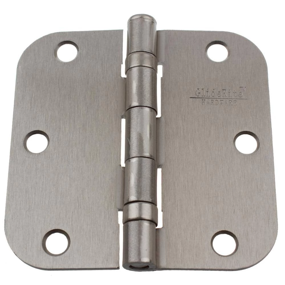 GlideRite Hardware brand interior residential steel full mortise ball bearing door hinges. Size 3-1/2 in. x 3-1/2 in. with 5/8 in. radius corners. Please see image for radius sizes. Fully assembled hinges with matching installation screws.