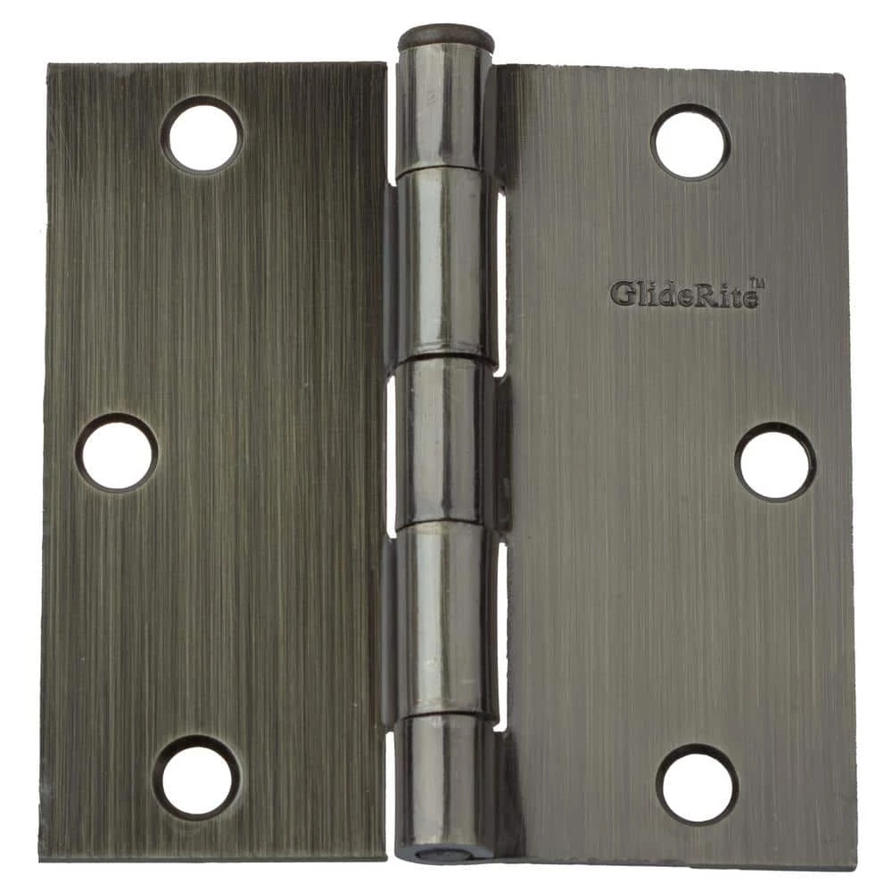GlideRite Hardware brand interior residential steel full mortise door hinges. Size 3-1/2 in. x 3-1/2 in. with square corners. Please see image for radius sizes. Fully assembled hinges with matching installation screws.