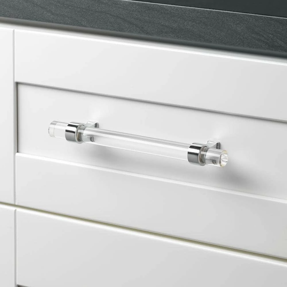 These 5 in. clear acrylic cabinet drawer Pull from GlideRite Hardware will add a unique touch to your kitchen and bathroom cabinet drawers. They will easily blend well with the rest of your decor. Each Lucite pull also features two polished chrome bases. Every pull is packaged individually to prevent damage to the finish and come with standard #8-32 x 1 in. screws for easy installation.